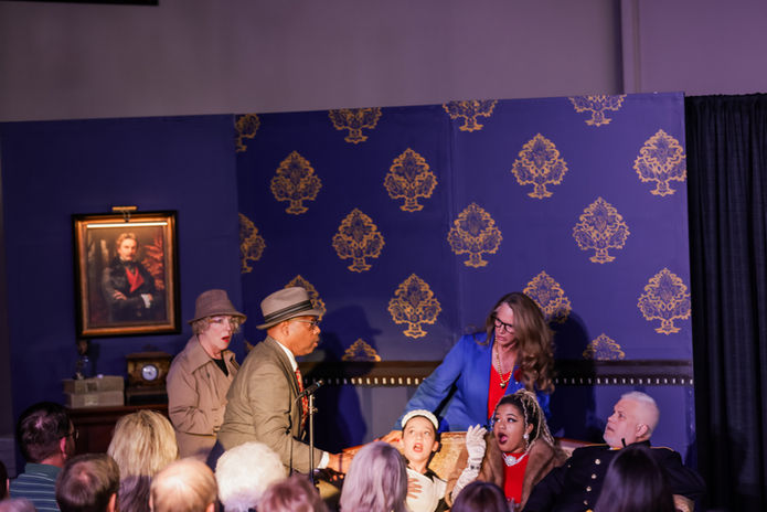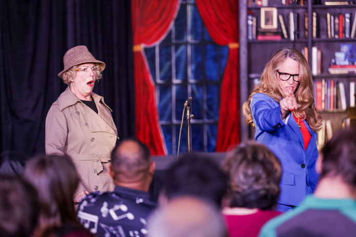 The story of “Murders and Mayhem at Magruder Mansion” COMES TO LIFE ON STAGE as Mr. Pembleton reads and Gladys gets hyped up on inspiration and twiztelers, freezing the story for edits as her mind is awhirl, moving characters, weapons and evidence, writing four unique and distinct hilarious endings!